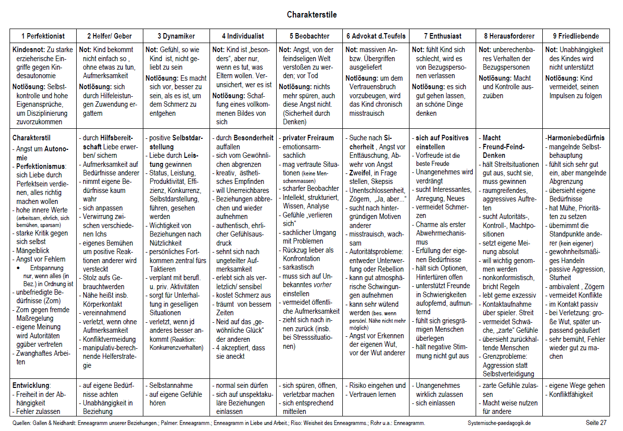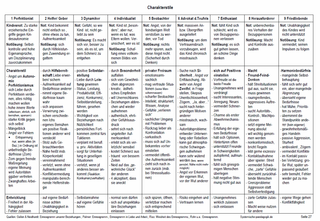 In der Psychologie gibt es zahlreiche Modelle zu Persönlichkeitstypen bzw. Charakterstilen. Nicht immer gehen sie dabei auf Kindheitsnöte als Hintergrund ein. Ich stelle Ihnen hier in sehr kurzer, tabellarischer Übersicht meine Version eines bewährten Modells mit neun Persönlichkeitstypen vor, das sogenannte „Enneagramm“. In dieser Version finden Sie gegebene Kindheitsthemen, mit ihnen entstandene Fähigkeiten und ggf. anstehende Entwicklungsräume. Unabhängig vom jeweiligen Charakterstil ist der Blick von hinten nach vorne (auf Kompetenzen und Zukunft) sinnvoll und unterstützend.